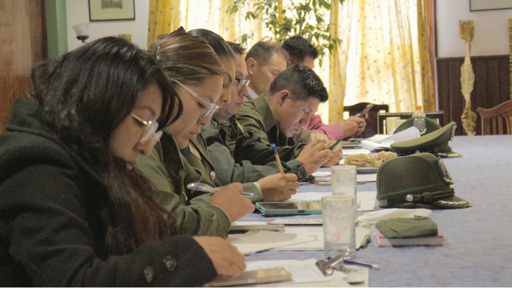 El nivel de detalle con el que se revisaron los alcances del proyecto abrió un espacio de diálogo para que las y los participantes, provenientes de distintos ámbitos de la Policía Boliviana, expresaran sus inquietudes. Entre ellas destacaron la necesidad de contar con mejores condiciones materiales para realizar investigaciones más eficaces, así como la incorporación de mecanismos adicionales de vigilancia —como bodycams— que permitan identificar a funcionarios que incurran en estos actos.