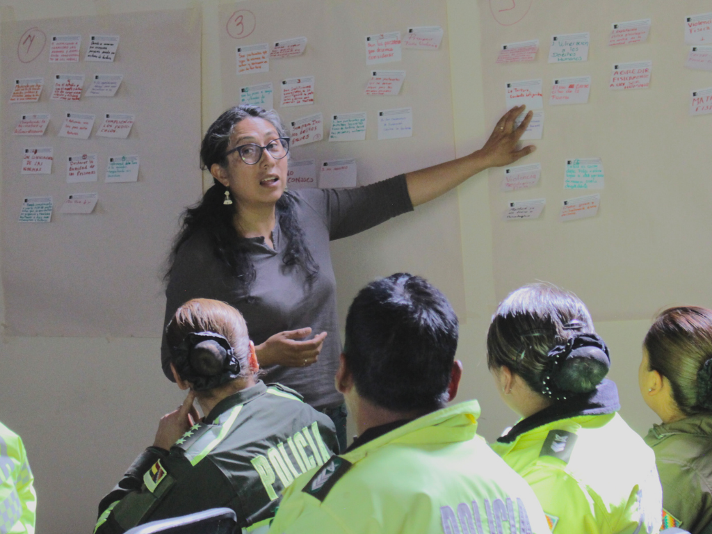 El enfoque formativo del ITEI, toma en cuenta que todas las personas vienen siempre con un conocimiento propio a partir del cual se comienza la problematización del tema que se quiere trabajar. Por eso, Carla Achá, la responsable de formación del ITEI comenzó el espacio con algunas preguntas detonantes en la que las personas asistentes, miembros de diferentes unidades de la Policía Boliviana, compartieron su comprensión inicial alrededor de este tema.