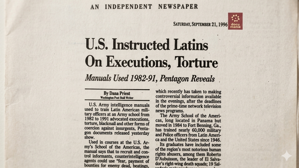 Por un lado, el New York Times tituló: “Old U.S. Army Manual for Latin Officers Urgen Rights Abuses” [El antiguo manual del ejército estadounidense para oficiales latinos insta a abusos de derechos]; el Washington Post decía de forma más cruda: “U.S. instructed Latins on Executions, Torture” [Estados Unidos instruyó a los latinos sobre ejecuciones y tortura].